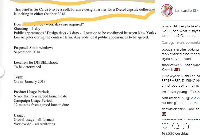 A informação foi desmentida logo em seguida por Bill Wackermann, diretor executivo da Wilhelmina. Em uma publicação no Instagram, Wackermann comentou: “Fale a verdade, querida! O contrato da Diesel foi feito pensando somente na única Queen. Tenho como provar.” Massss, a publicação foi apagada. Cardi publicou um print que prova ter recebido uma proposta da Diesel, e a publicação também foi apagada:
