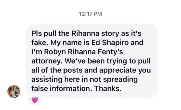 “Por favor, removam a história sobre a Rihanna, pois ela é falsa. Meu nome é Ed Shapiro e eu sou o advogado de Robyn Rihanna Fenty. Temos tentado retirar todas as postagens e agradecemos sua ajuda em não espalhar informações falsas.”